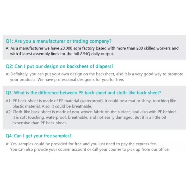 Breathable Backsheet/PP Backsheet; Non-woven Topsheet, Elastic Waist; Non-woven Frontal Tape; Magic Side Tape/PP Side Tape; |